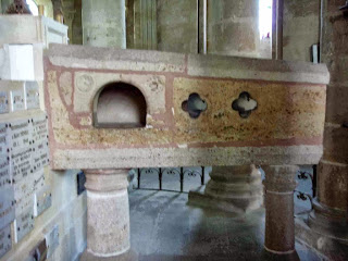 J'entre donc dans l'édifice roman, qui est en pleine réfection, et me dirigeant derrière le chœur, j'aperçois la fameuse débredinoire qui n'est autre que le sarcophage mérovingien abritant les restes de Saint-Menoux.